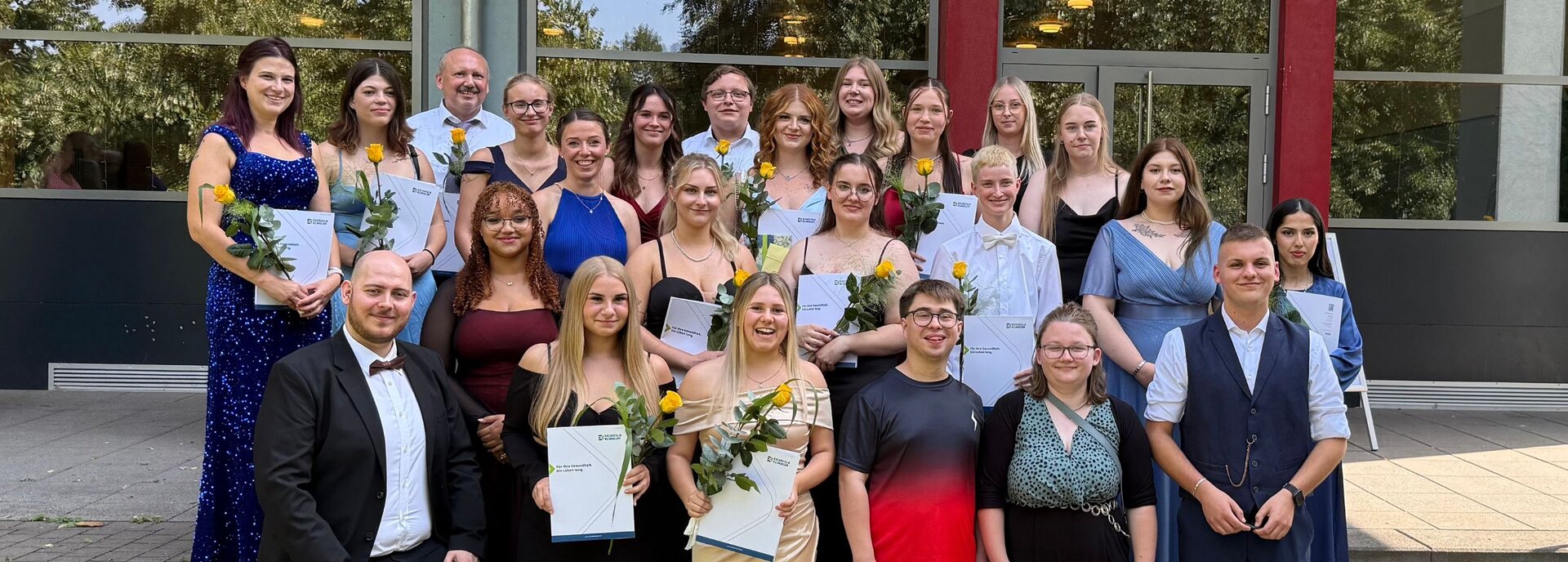 Das Eichsfeld Klinikum verabschiedete feierlich 36 junge Menschen, die ihre Ausbildung zur Pflegefachkraft erfolgreich abgeschlossen haben. Der Festakt fand in der Lindenhalle in Niederorschel statt und war nach einer intensiven und lehrreichen Zeit ein Höhepunkt für die Absolventinnen und Absolventen des Klinikums. „Wir freuen uns sehr, dass wir diese jungen Menschen ausbilden durften und bestens auf die Herausforderungen des Berufsalltags vorbereitet haben. Wir sind stolz auf die Leistungen und das Engagement unserer jungen Pflegeprofis und wünschen alles Gute für die berufliche und private Zukunft!“, so Dr. Dietmar Wiederhold, Leiter des Bildungsinstituts des Klinikums. Pflegedirektorin Carmen Franke und Personalleiter Robert Hitzigrath schließen sich den Glückwünschen an und sind besonders stolz, dass fast alle der Absolventinnen und Absolventen auch nach der Ausbildung im Team des Klinikums bleiben. Carmen Franke dazu: „Gemeinsam haben wir über Perspektiven und Möglichkeiten in unserem Klinikum gesprochen und so entsprechend der persönlichen Wünsche zu Einsatzbereichen oder Stationen passende Jobangebote machen konnten.“