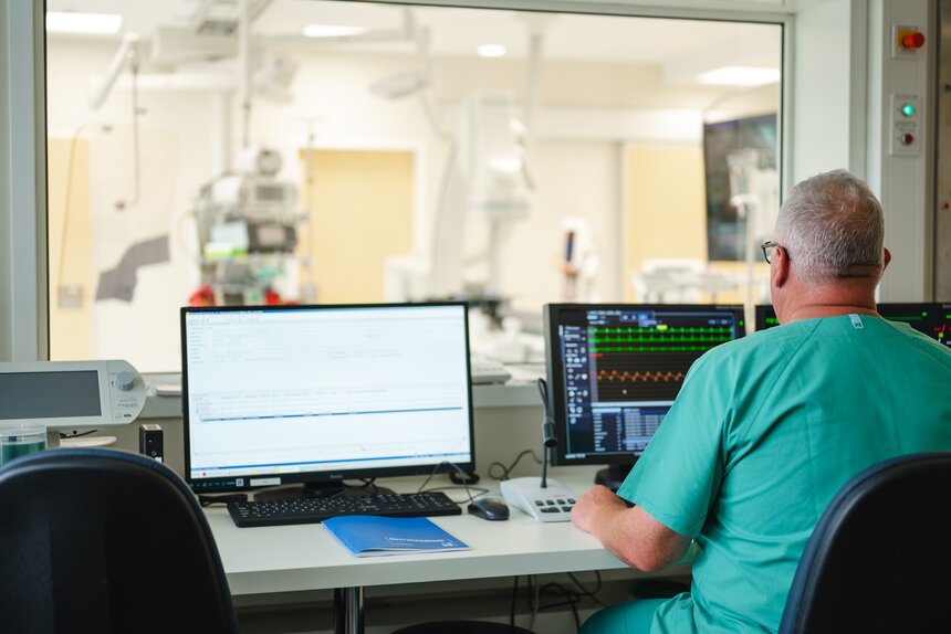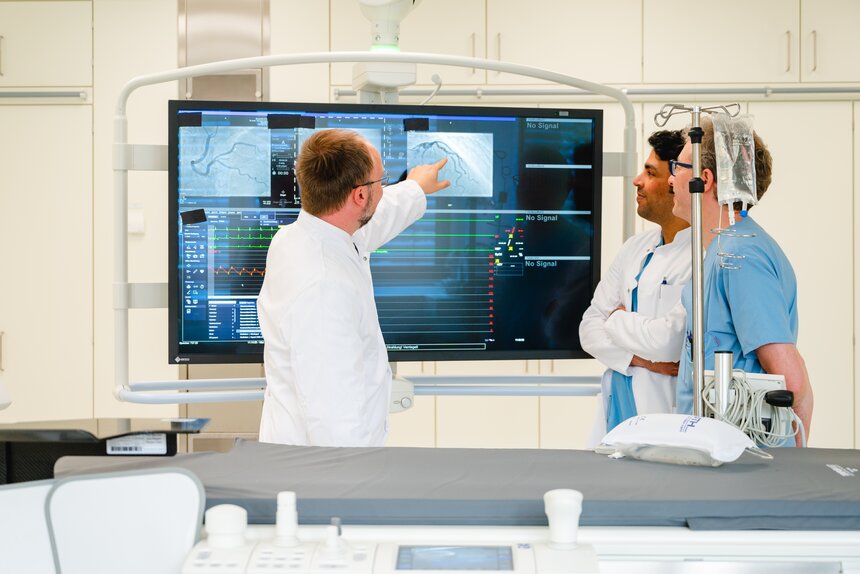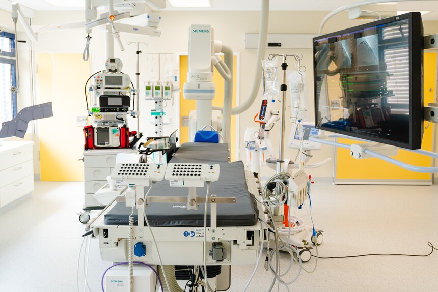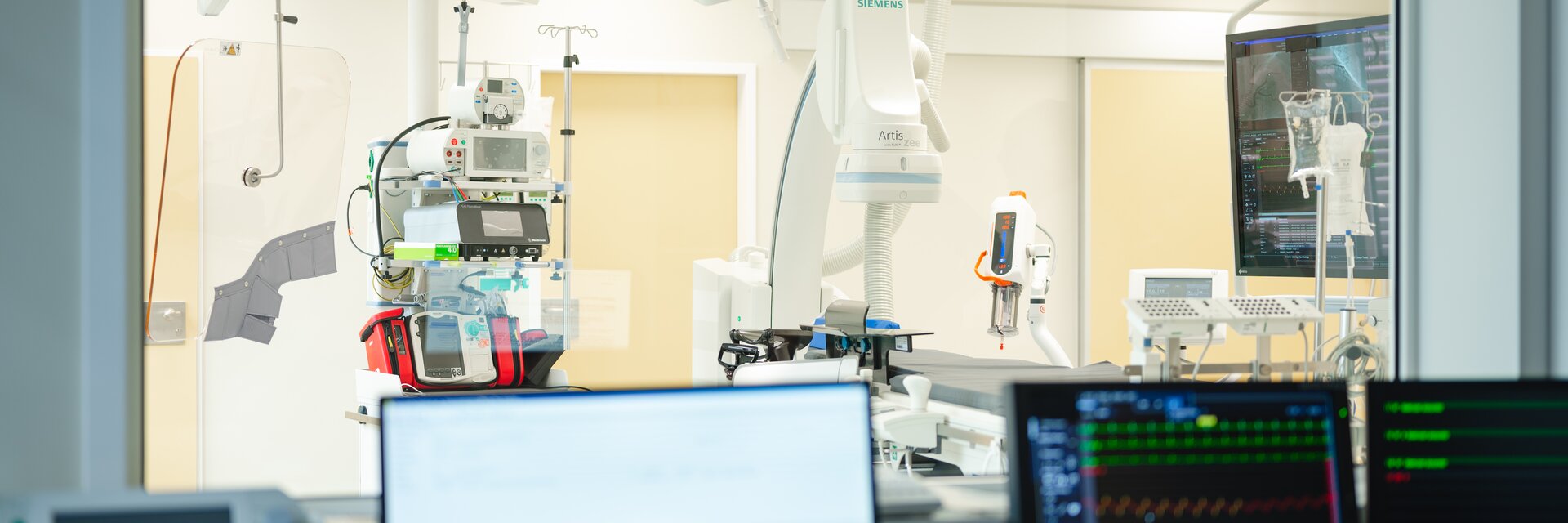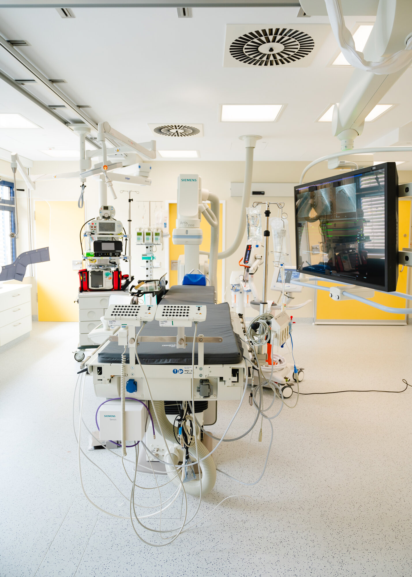 Das Behandlungsspektrum umfasst die Diagnose und Therapie der koronaren Herzerkrankung (KHK), von Herzinfarkten, Herzklappenerkrankungen, Herzschwäche oder Herzrhythmusstörungen. Da das Labor als sogenannter Hybrid-Operationssaal konzipiert wurde, weist es deutlich höhere Hygienestandards als herkömmliche Herzkatheterlabore auf und ermöglicht neben der Diagnostik und Behandlung von Herzerkrankungen vielfältige Eingriffe am Herzen – von minimal-invasiver Chirurgie bis hin zu komplexen Operationen am Herzen und herznahen Gefäßen.Besonders in Akutfällen sind wir mit diesem Raumkonzept bestens für spontane Eingriffe gerüstet und notfallmedizinisch jederzeit voll einsatzbereit.