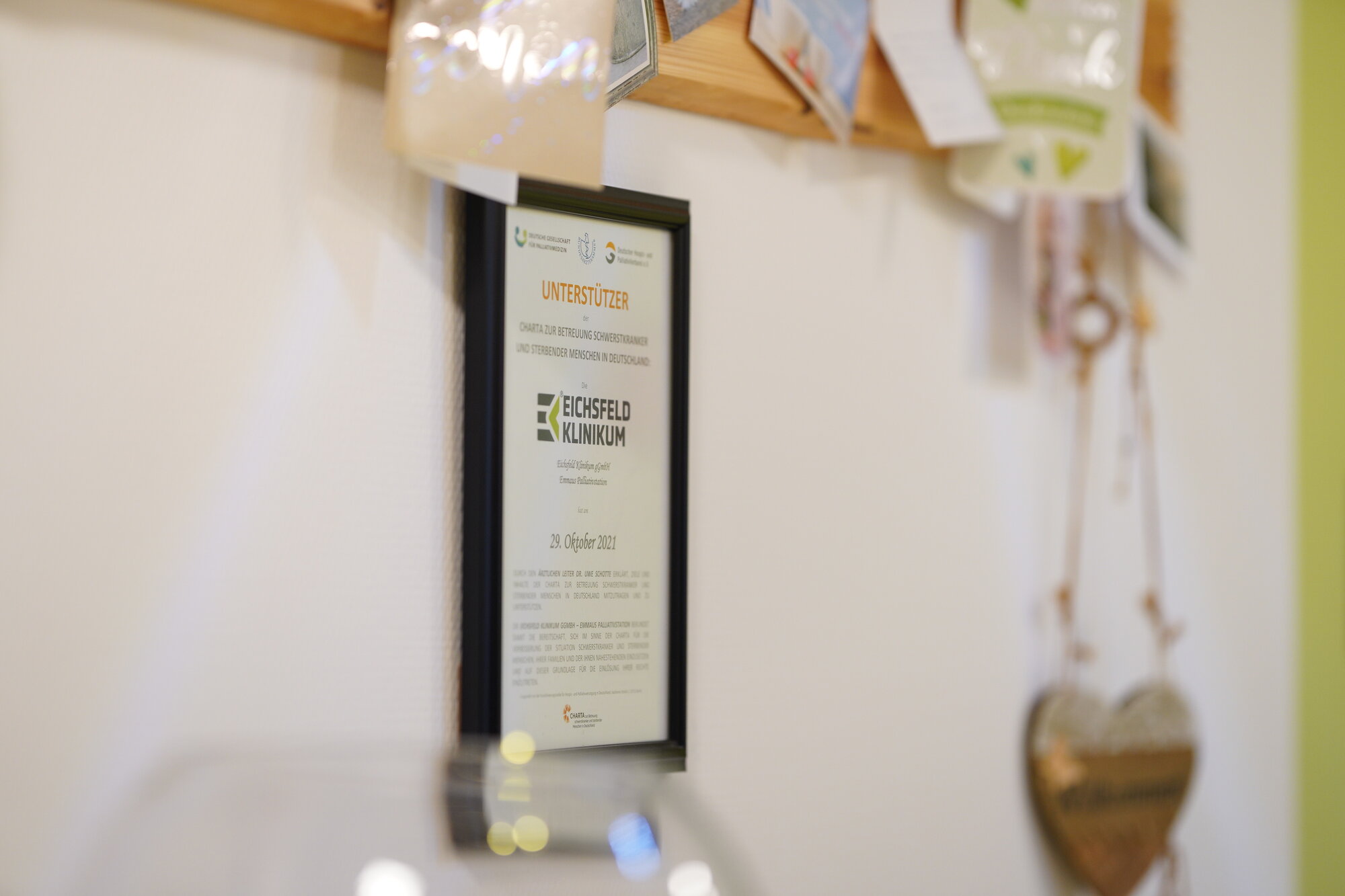 Die meisten unserer Zimmer sind mit großen Fenstern und eigenem Balkon ausgestattet. An die Station angeschlossen ist ein Gemeinschaftsbereich, der zum gemeinsamen Frühstück, aber auch für Spiele und Gespräche oder Aktivitäten wie Waffelbacken genutzt wird. Die Palliativstation des Eichsfeld Klinikums ist liebevoll und freundlich gestaltet. Auch das geliebte Haustier darf gerne zu Besuch kommen. Zudem können Angehörigen nach Absprache in der Klinik bleiben, auf Wunsch auch rund um die Uhr.